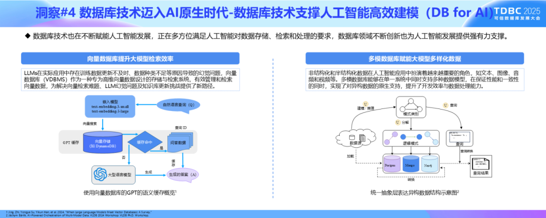 数据库技术支撑人工智能高效建模即DB for AI。一是向量数据库提升大模型检索效率。向量数据库作为一种专为高维向量数据设计的存储与检索系统,为解决向量检索难题、LLMs幻觉问题及知识库更新挑战提供了新路径。二是多模数据库赋能大模型多样化数据。多模数据库能够通过统一的存储引擎、查询接口和事务管理机制,保证性能和一致性的同时,实现对异构数据的原生支持,极大地简化系统架构,提升了开发效率与数据处理能力。