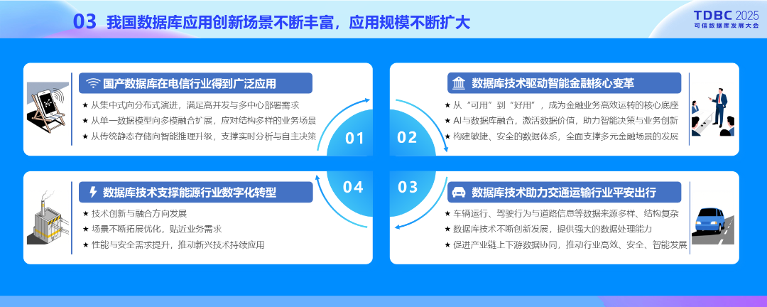 我国数据库应用创新场景日益丰富,应用规模持续扩大,自主可控程度不断加深, 高效赋能传统产业转型升级,促进数字经济和实体经济深度融合,助力新质生产力加快形成和发展。