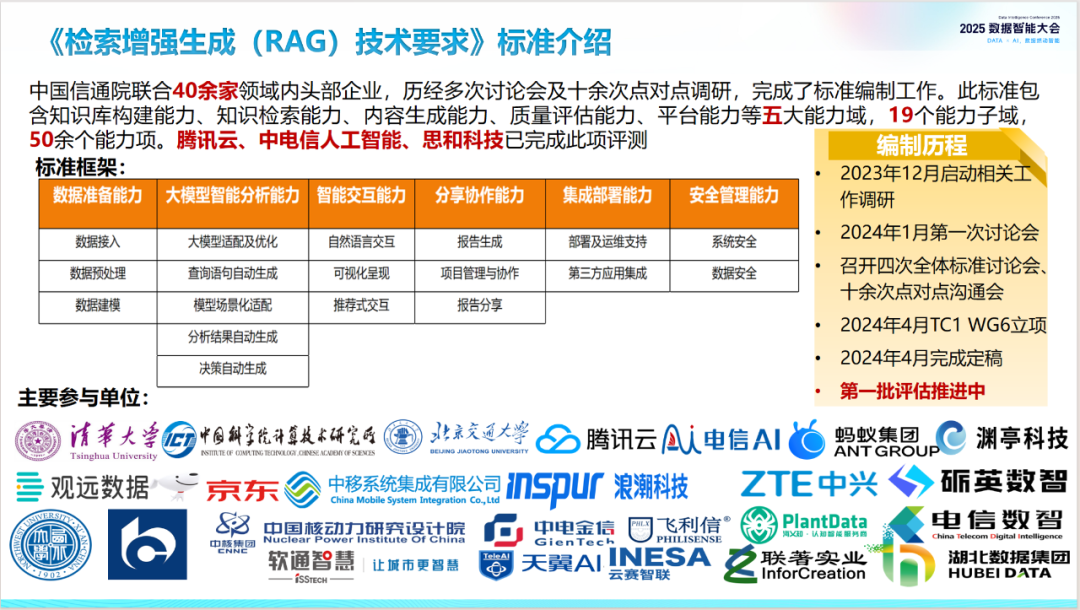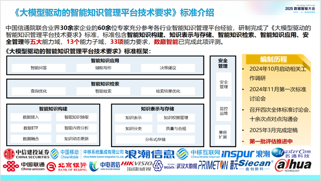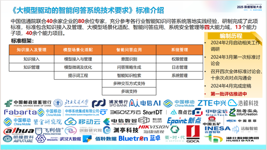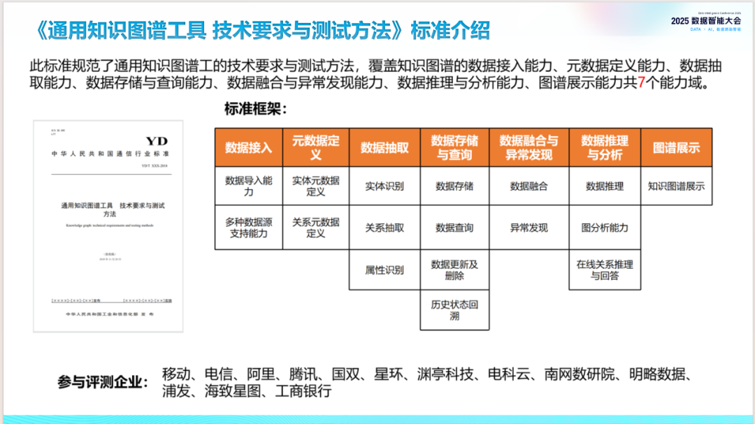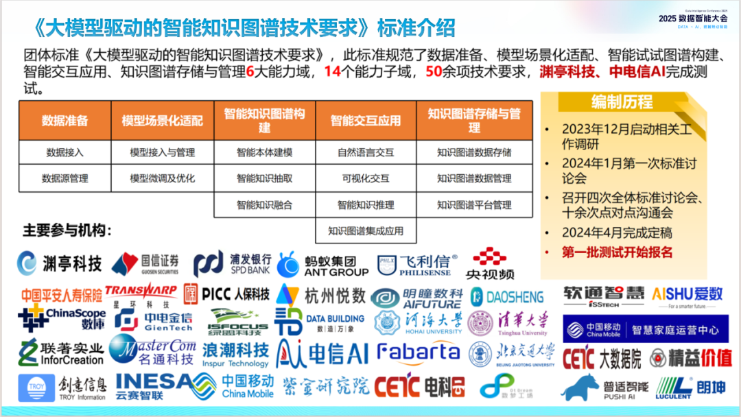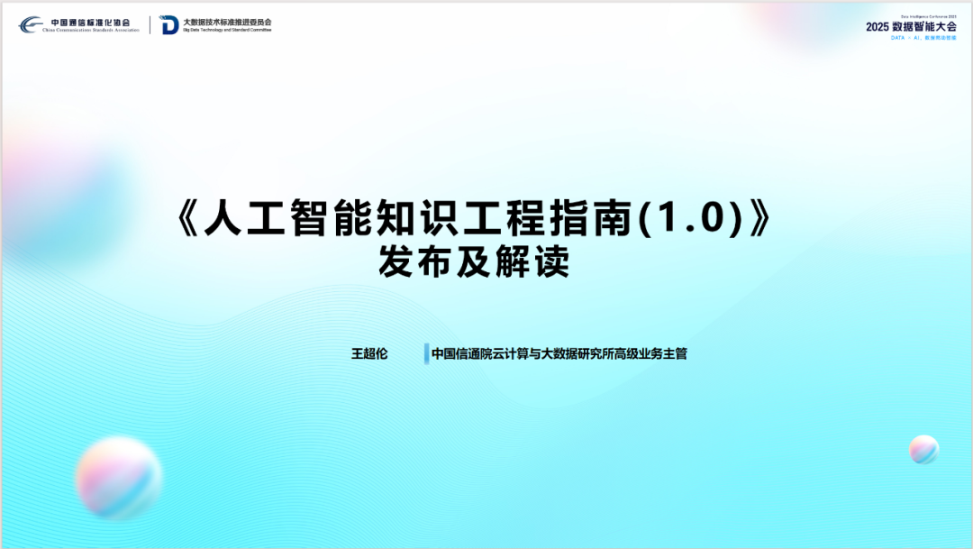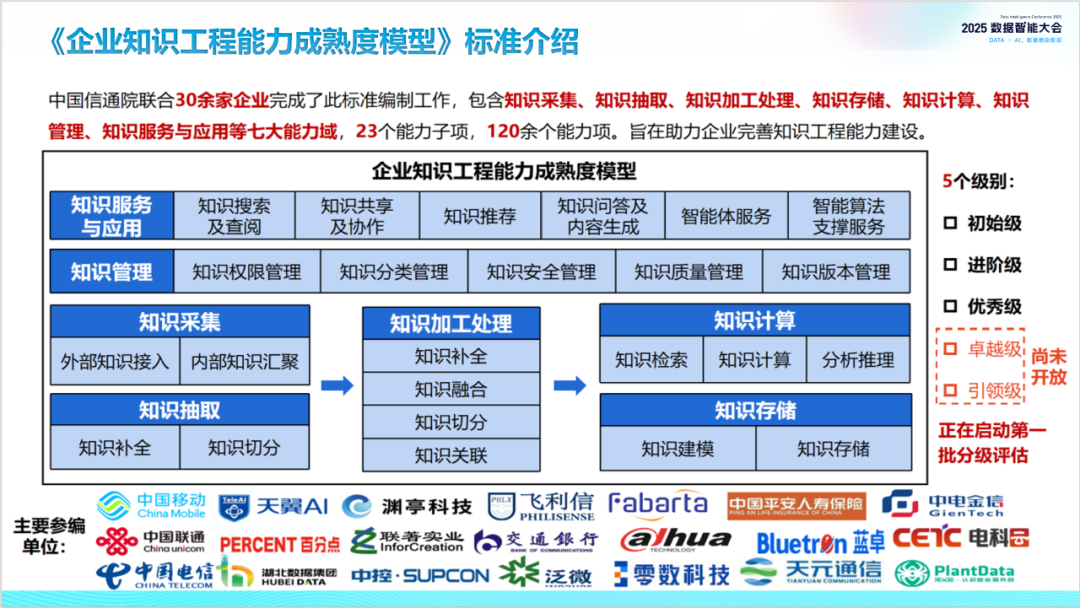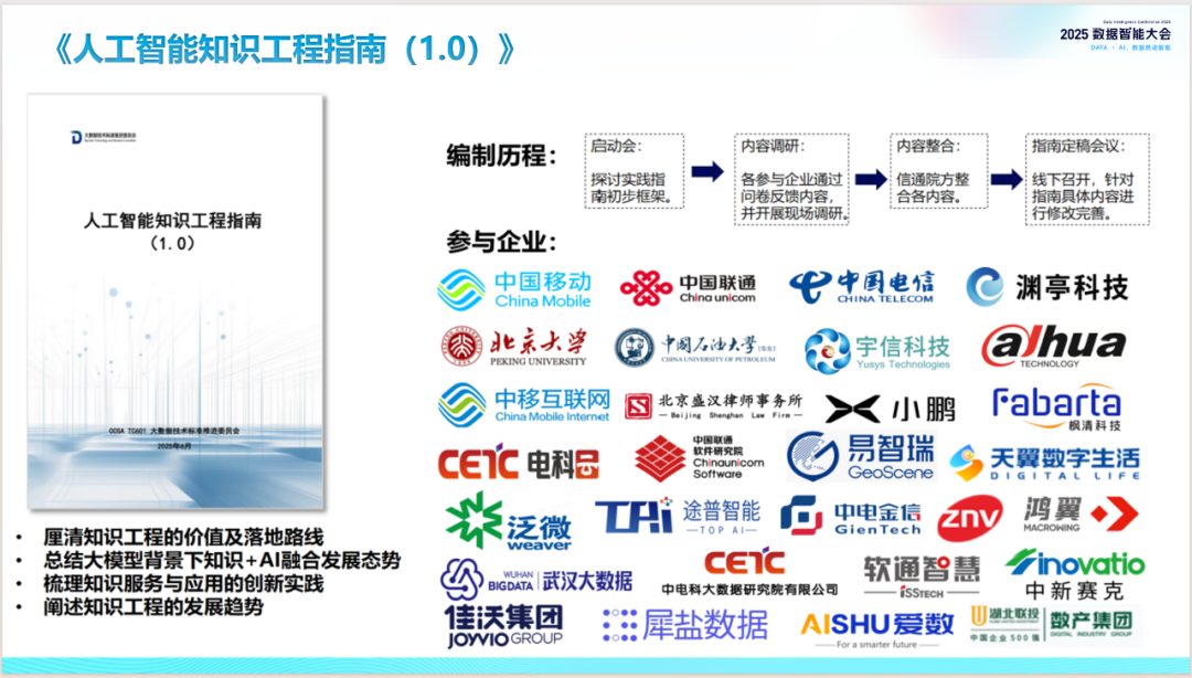 中国信通院自2018年起开始了知识领域相关标准化及研究工作,构建了《知识图谱工具技术要求与测试方法》《大模型驱动的智能知识图谱工具技术要求》《大模型驱动的智能知识管理平台技术要求》《知识中台能力成熟度模型》《知识工程能力成熟度模型》等多项标准,受到了各方广泛关注。为进一步助力各方开展知识工程实践落地,助力各行业新质生产力的发展,中国通信标准化协会大数据技术标准推进委员会(CCSA TC601)组织,联合众多行业专家共同编制《人工智能知识工程指南(1.0)》,并于2025数据智能大会进行了解读。