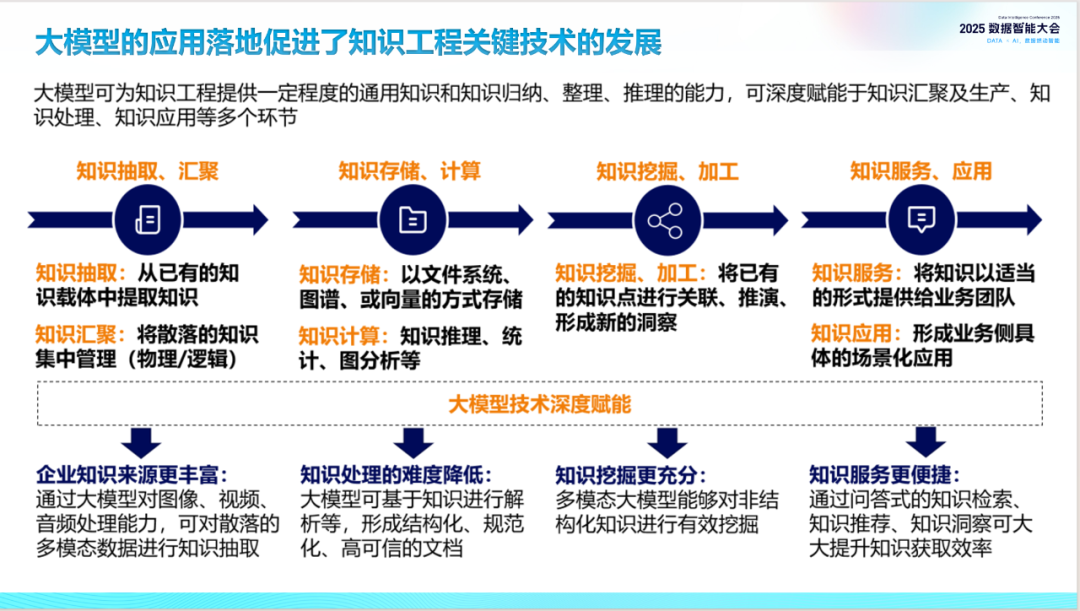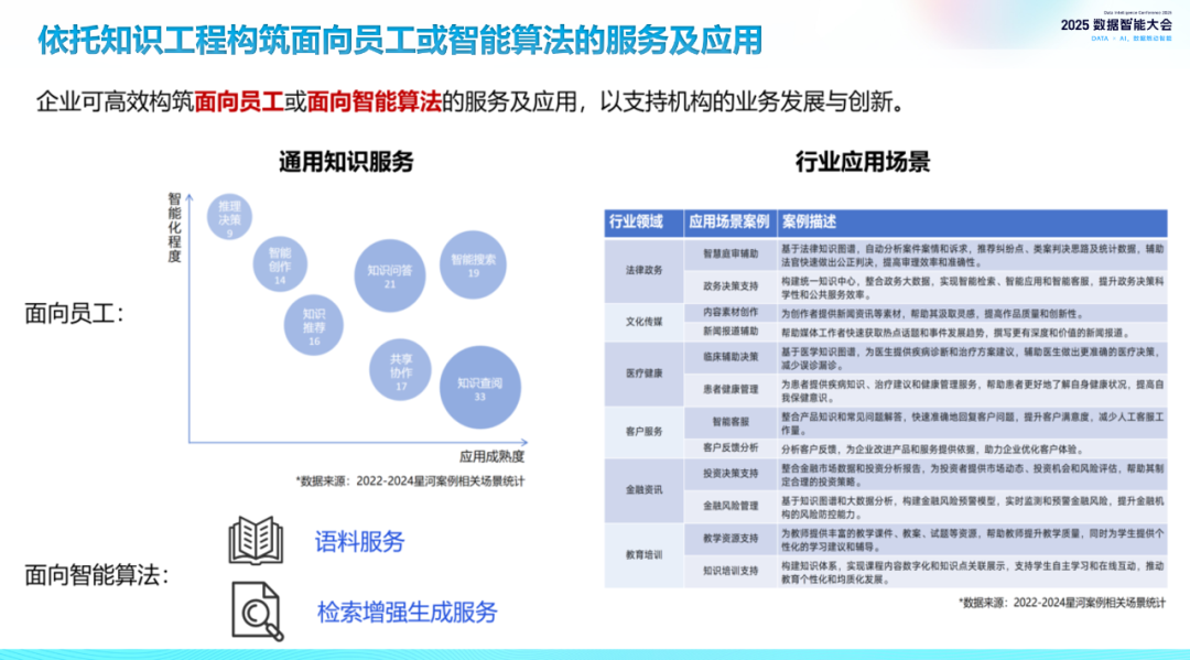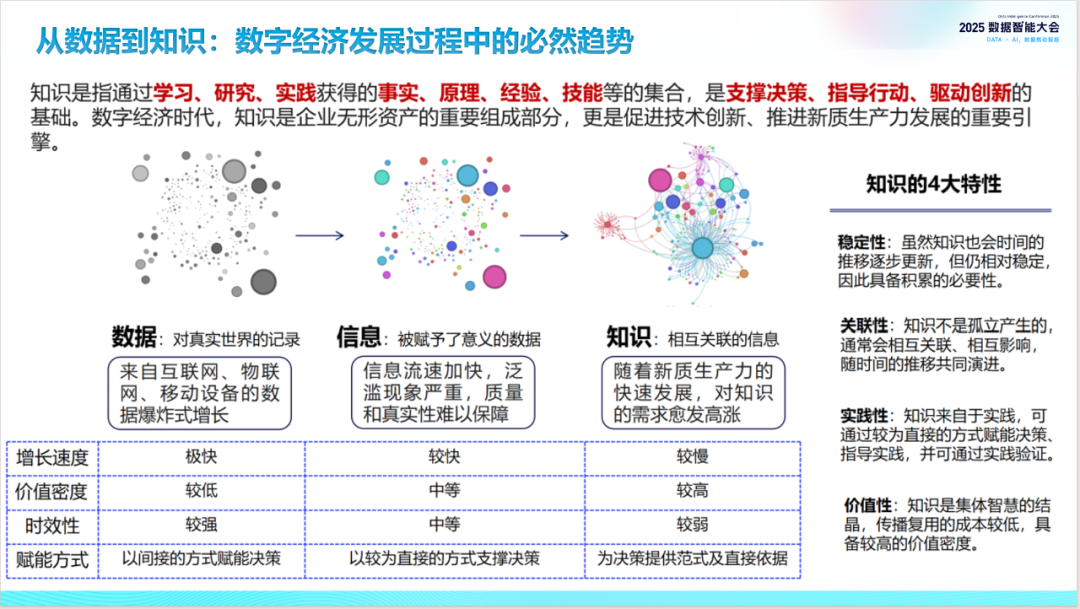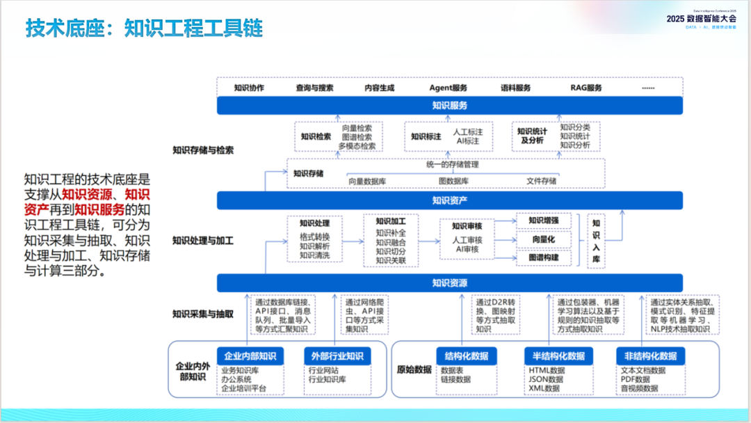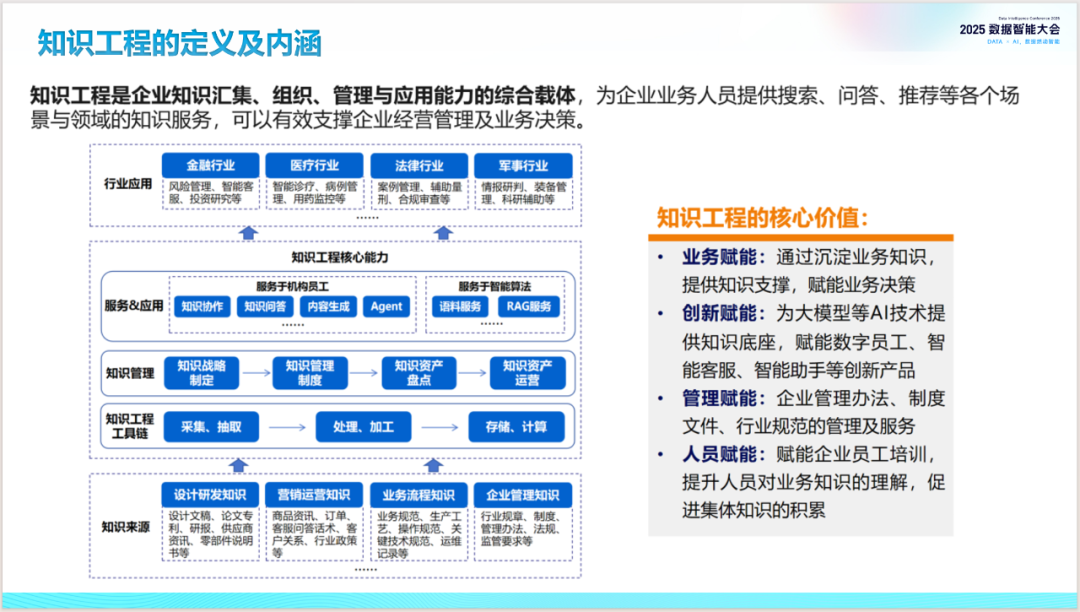 随着“人工智能+”行动的持续推进,如何通过大数据、人工智能技术赋能数智化建设是各方关注的重点问题。数智化的核心是从数据中提炼出有价值的知识,构筑智能算法及模型,并将其赋能于机构业务、管理过程中的关键环节,实现降本增效及业务创新。作为连接“数据”和“智能”的桥梁,知识是机构员工决策、行动和创新的重要依据,同时也为大模型等智能算法的开发应用提供了高质量的训练和推理资源,是大模型在垂直领域应用落地的关键要素之一。在此背景下,各机构逐步开始重视知识工程能力建设,通过构筑知识工程工具链、完善知识管理体系、打造知识服务能力来更好的管理和利用知识资产,为大模型、智能体的应用落地提供知识来源,并赋能知识共享及协作、知识检索、知识推荐、智能创作等场景,从而提升机构的核心竞争力。知识工程已成为人工智能时代企业数智化能力建设的新增量。