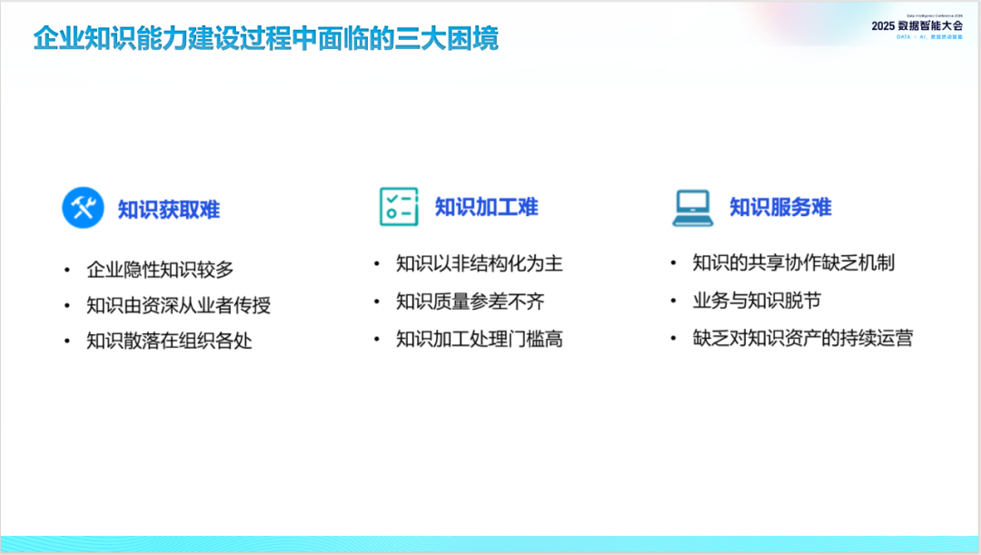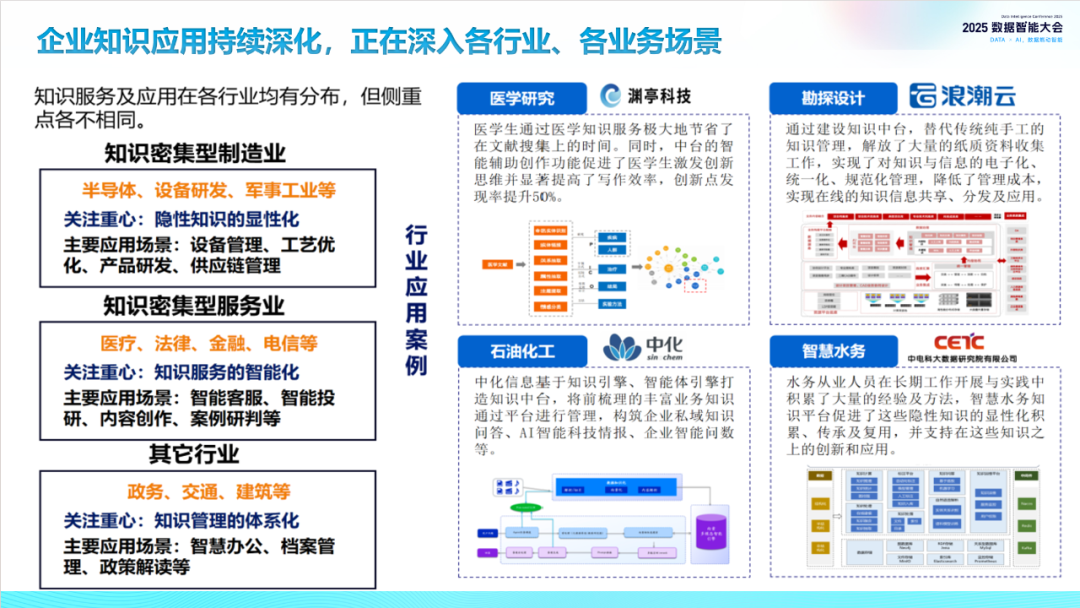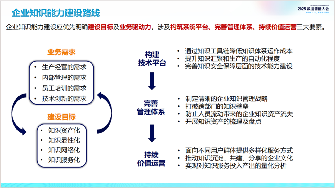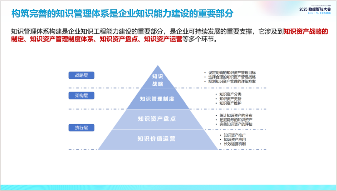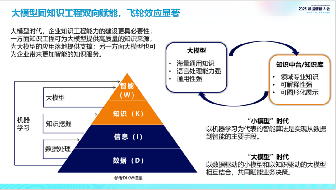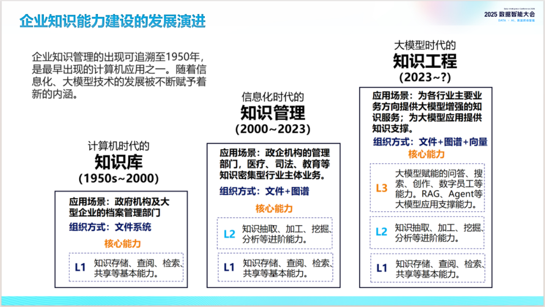 随着“人工智能+”行动的持续推进,如何通过大数据、人工智能技术赋能数智化建设是各方关注的重点问题。数智化的核心是从数据中提炼出有价值的知识,构筑智能算法及模型,并将其赋能于机构业务、管理过程中的关键环节,实现降本增效及业务创新。作为连接“数据”和“智能”的桥梁,知识是机构员工决策、行动和创新的重要依据,同时也为大模型等智能算法的开发应用提供了高质量的训练和推理资源,是大模型在垂直领域应用落地的关键要素之一。在此背景下,各机构逐步开始重视知识工程能力建设,通过构筑知识工程工具链、完善知识管理体系、打造知识服务能力来更好的管理和利用知识资产,为大模型、智能体的应用落地提供知识来源,并赋能知识共享及协作、知识检索、知识推荐、智能创作等场景,从而提升机构的核心竞争力。知识工程已成为人工智能时代企业数智化能力建设的新增量。