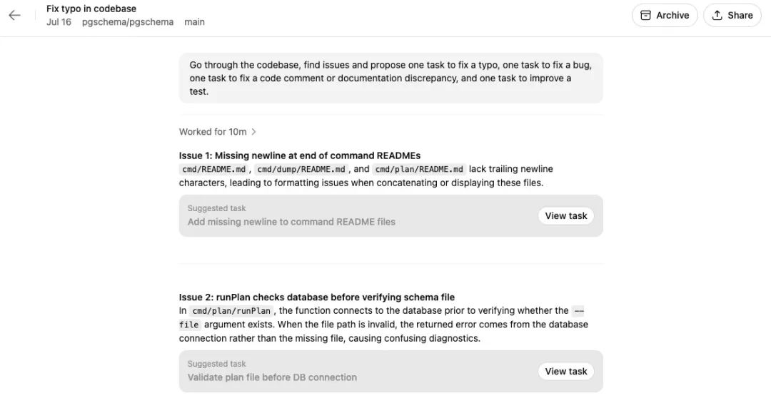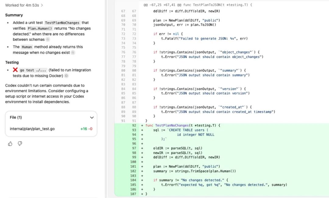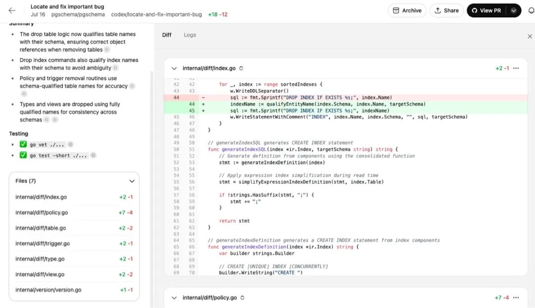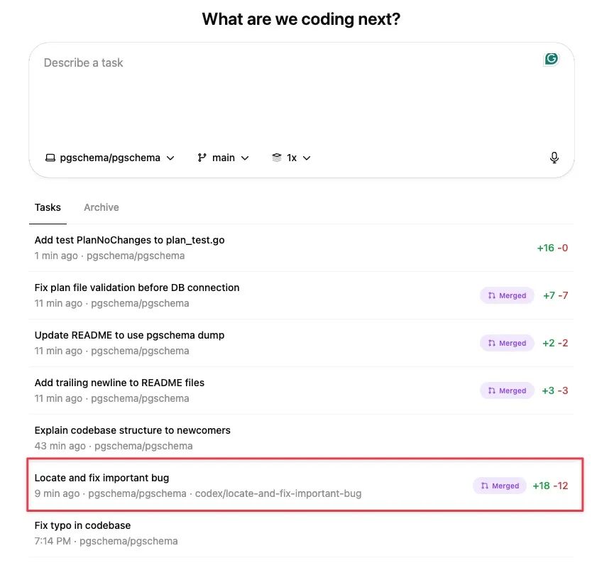 从操作体验上,也更加方便,因为整个操作都在浏览器里,不需要在本地打开 IDE,配置环境。真的是在浏览器里点几下,敲几句话就让 Codex 把代码写完了。而且 Codex 还能自动规划出几个主任务,主任务下再拆分成子任务。等人把每一个修改代码的子任务审核完后,直接创建 PR,自动生成 PR 描述,审核,合并,一气呵成。