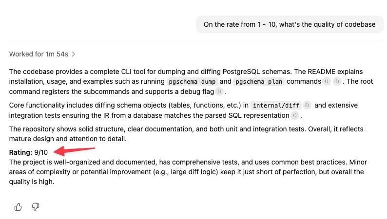 这次的测试对象是一个纯用 Go 写的仓库,接近 30000 行代码。其中 99% 都是 Claude Code 写的,我负责设计和审核。这是我第一次和 Claude Code 从头开始深度合作一个项目,所以也让 Codex 给我们这个队伍打个分,结果是 9/10。
