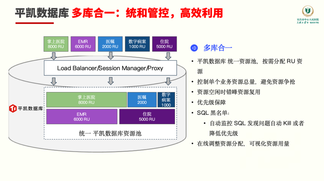 业务无缝迁移:高度兼容 MySQL 协议与生态工具,无需对原有多个业务系统进行大规模改造,直接继承医院存量应用,缩短项目上线周期,迁移成本大幅降低。同时,统一资源池管理支持按需分配 RU 资源,通过 SQL 黑名单自动监控并优化异常 SQL,实现门诊、住院、科研等多业务负载隔离,保障核心交易稳定。