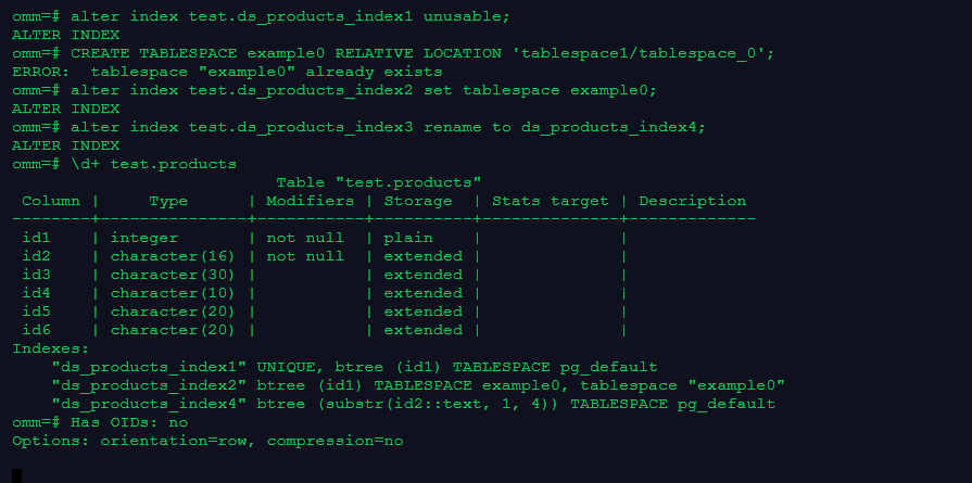 alter index test.ds_products_index1 unusable;