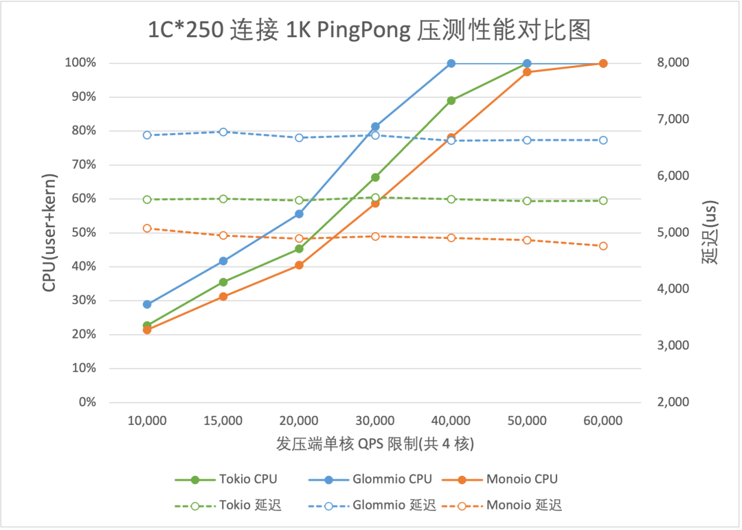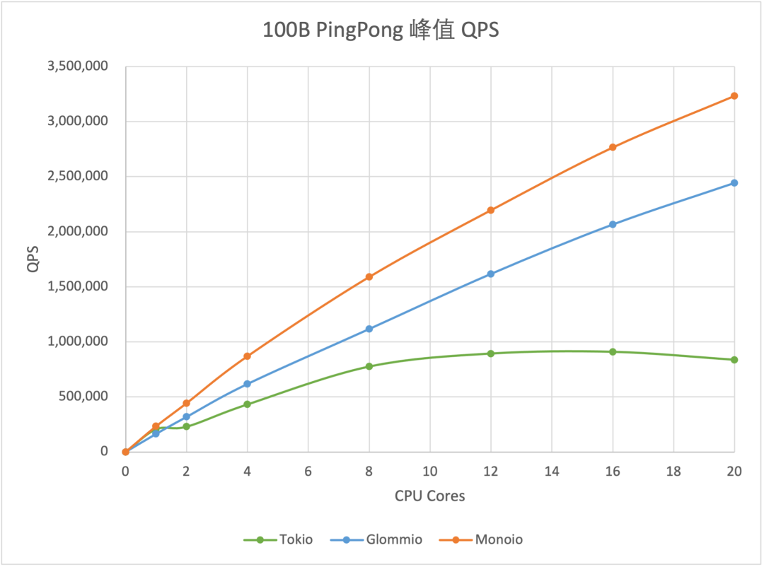 我们对比了 Monoio、Tokio 和 Glommio(另一个类似的 Runtime,但在性能目标上不如 Monoio 激进)。