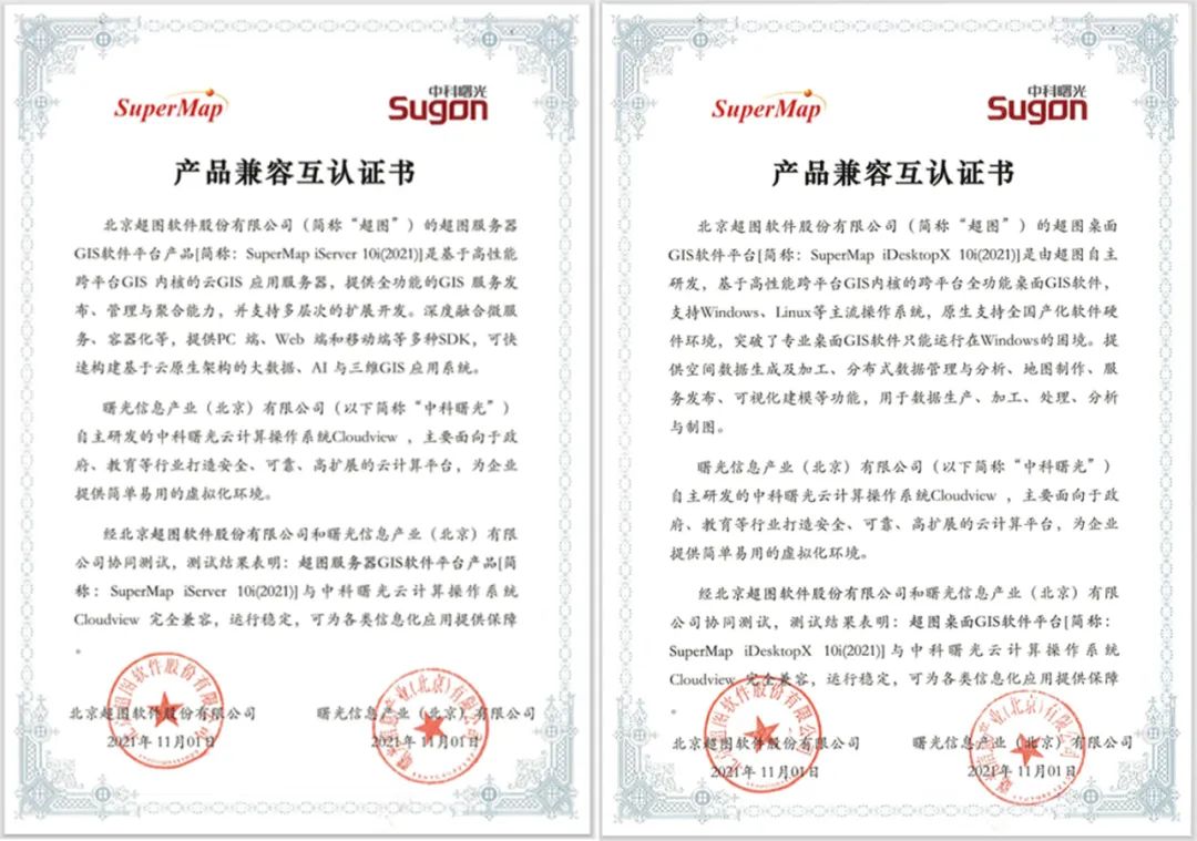 近日,超图服务器GIS软件平台产品SuperMap iServer 10i(2021)、桌面GIS软件平台产品SuperMap iDesktopX 10i(2021)与曙光信息产业股份有限公司(简称:中科曙光)云计算操作系统Cloudview正式通过技术兼容性测试并共同输出证明报告,测试结果表明兼容性良好、稳定运行、性能卓越。