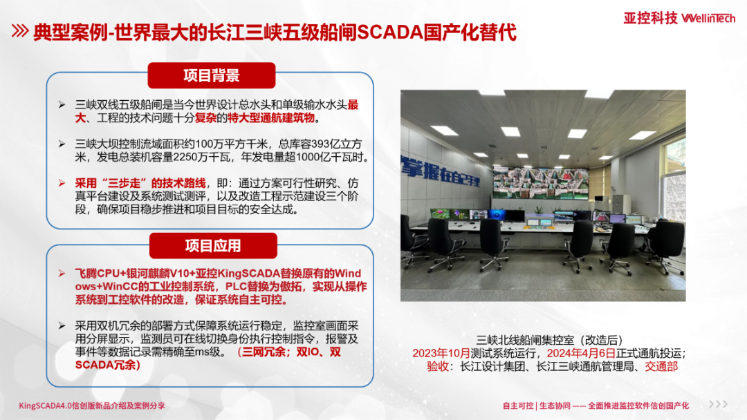 长江三峡五级船闸项目:全生态信创替代(飞腾CPU+银河麒麟+亚控软件),实现双机冗余和ms级事件记录,保障世界最大船闸的安全运行。