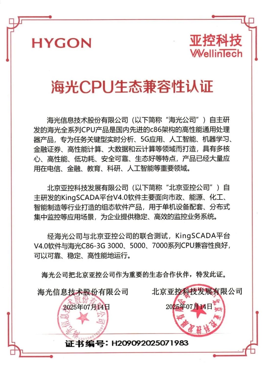 经过双方一系列全面严谨的认证测试后,双方认定亚控科技KingSCADA平台4.0软件与海光信息技术有限公司的海光C86-4G5000、7000系列以及海光C86-3G3000、5000、7000系列CPU完成兼容性测试,能够达到通用兼容性要求及可靠、稳定、高性能运行要求,满足用户的关键性应用需求。