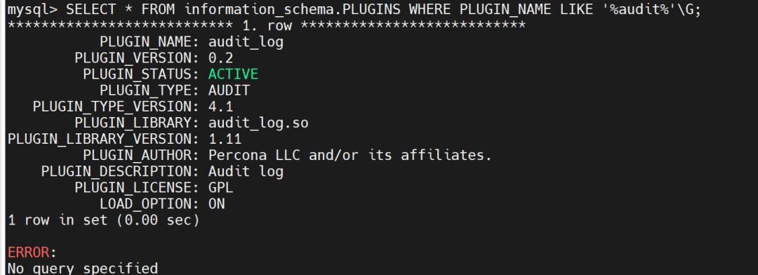 SELECT * FROM information_schema.PLUGINS WHERE PLUGIN_NAME LIKE '%audit%';