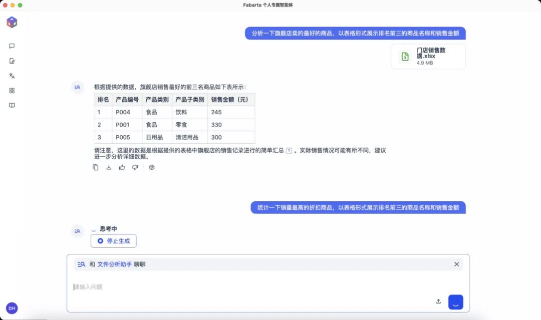 在智能数据分析方面,Fabarta个人专属智能体在非结构化文档分析的基础上,具有强大的基于本地众多复杂数据文件的分析能力,可通过智能体大脑协助用户完成基于复杂结构化数据的各种分析任务并快速给出数据概览,且可通过简单对话的方式,在保证数据安全的前提下及时响应用户的分析需求,弥补大语言模型对结构化数据分析计算方面的天然缺陷。