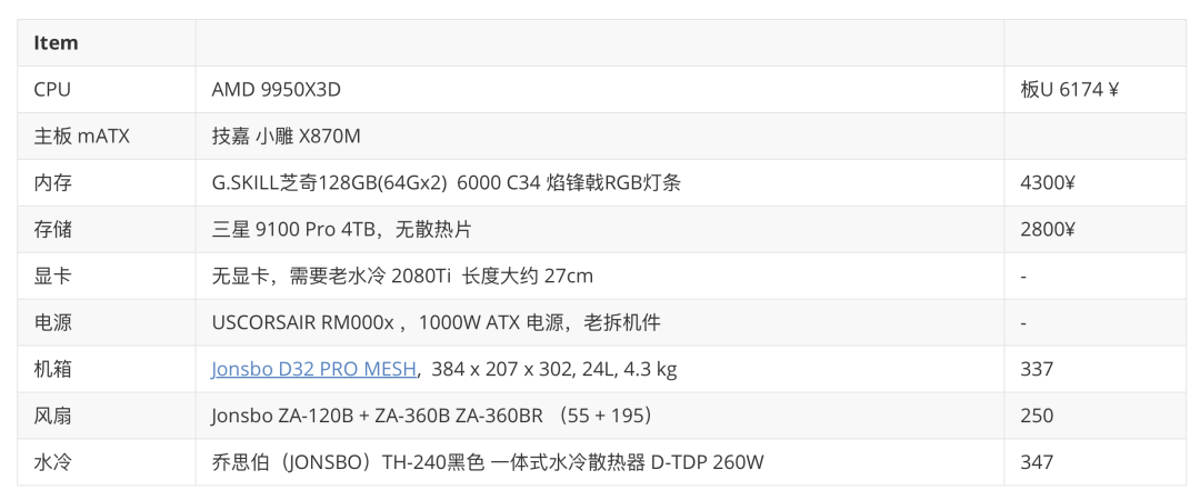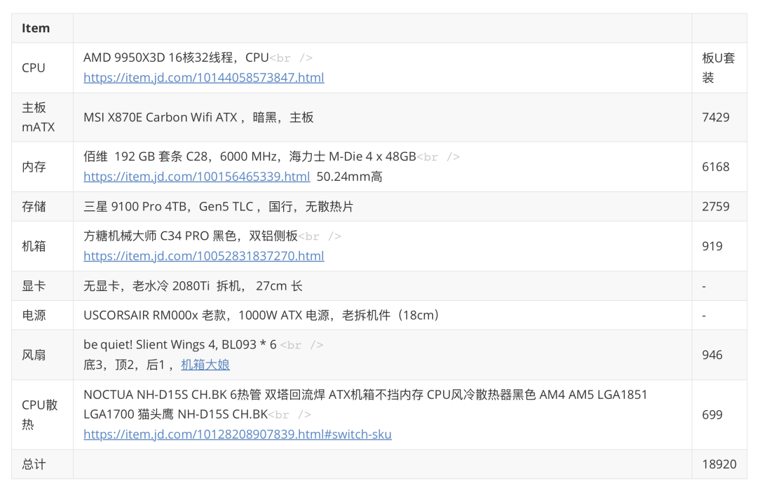 退货之后,我开始琢磨着既然 AI MAX 笔记本不行,要不还是弄个 9950x3D 的 ITX 机器吧,然后我就开始调研各种配件,出了一个 ITX 的配置单。然而在和店家/朋友沟通交流的时候,老板坦诚的说你这个配置 ITX 压不住,换个 MATX 机箱吧。