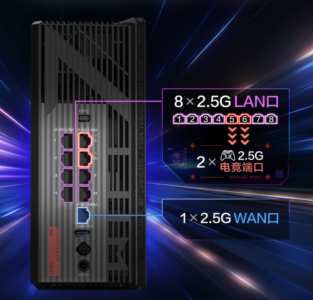目前老冯最满意的采购是这个华硕 ROG 魔盒 Wifi 7 路由器,9个 2.5G 网口,加上稳定 1ms 的无线延迟,体验倍儿棒。