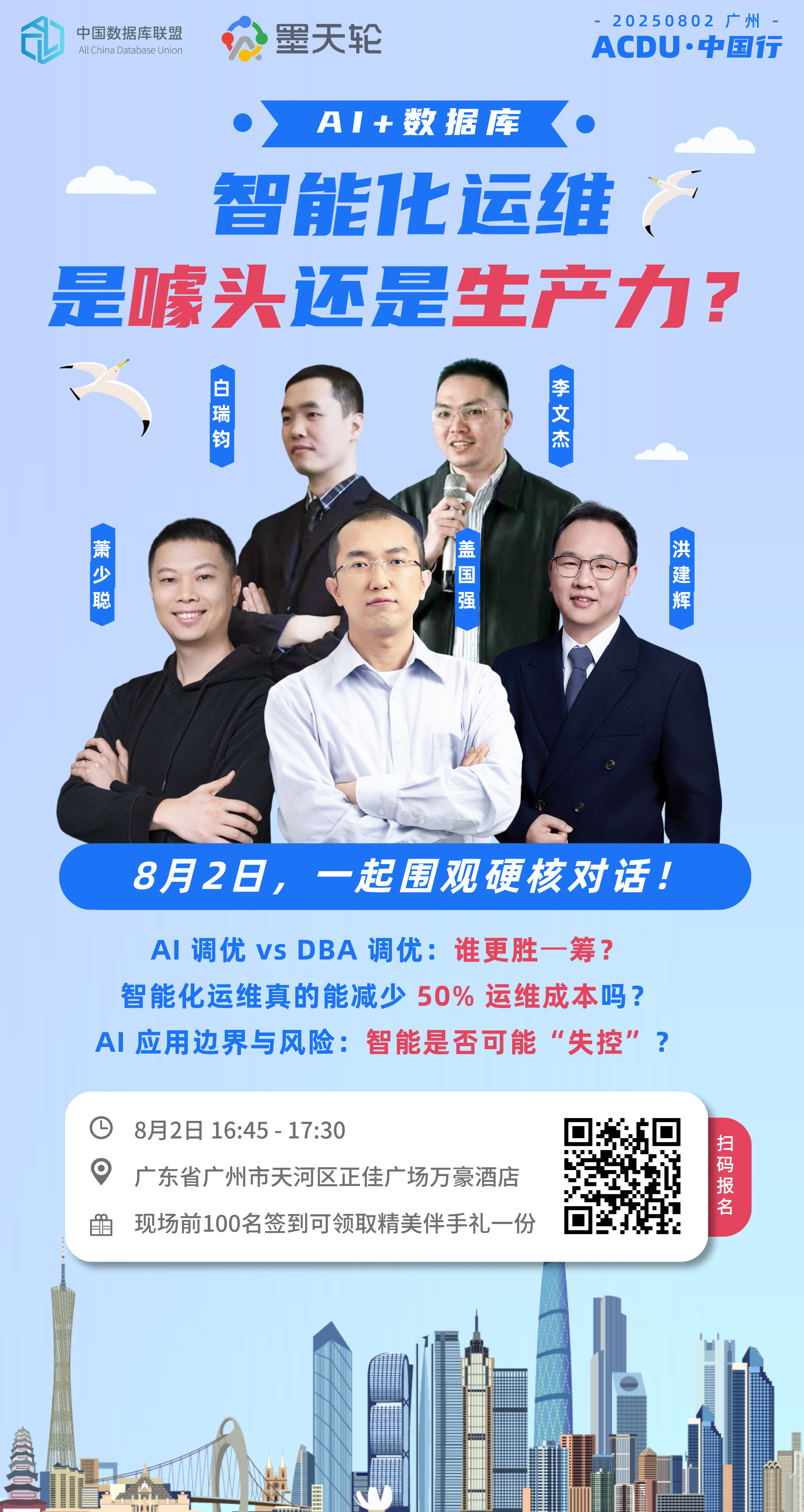 8 月 2 日,【ACDU·广州站】特别策划圆桌论坛,将以 「AI + 数据库:智能化运维是噱头还是生产力?」为主题,邀请数据库厂商、技术专家、甲方企业代表和行业主持人同台,展开一场硬核对话。