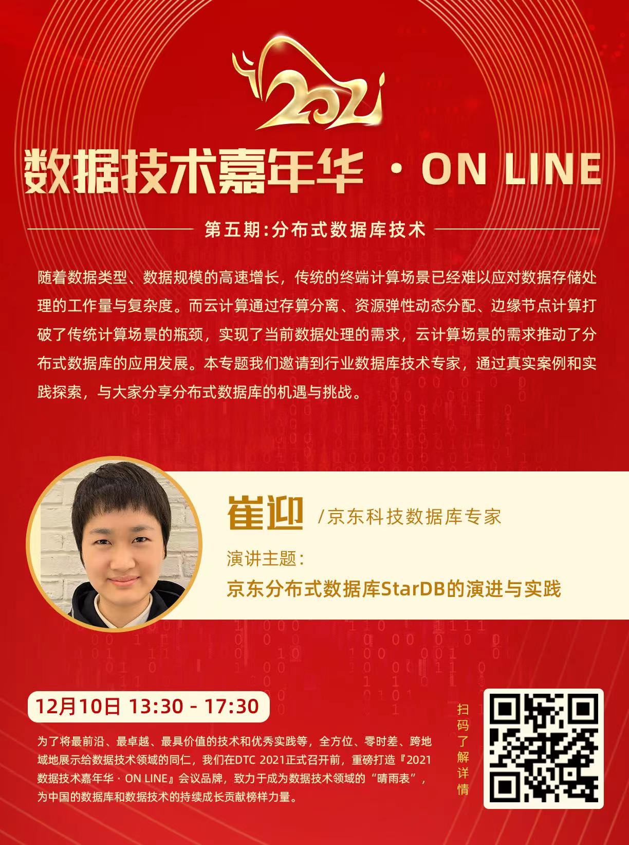 12月10日下午14:10-14:50,京东科技数据库专家崔迎做客2021数据技术嘉年华·ON LINE (第五期),为您详细解读分布式数据库技术演进背景与京东的大规模实践。
