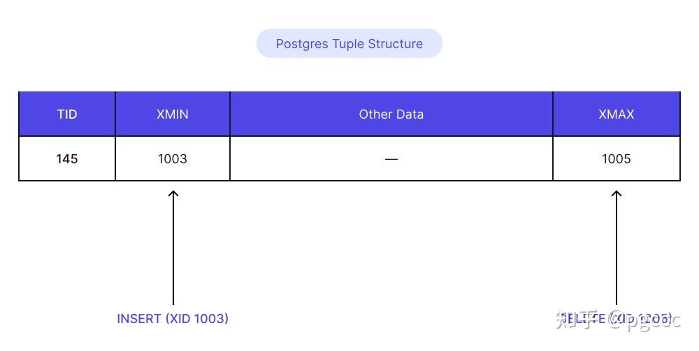 要理解实际传递的信息hot_standby_feedback,我们必须首先了解 Postgres 中元组版本控制的工作原理。Postgres 中的每个元组都有两个关键的元数据属性: xmin 和 xmax。存储创建 或 插入 该特定元组版本的xmin事务的事务 ID (XID) ,而 存储更新 或 删除该元组版本的事务的 XID ,从而有效地将其标记为已过时。当元组被删除时,其 值将使用删除事务的 XID 进行更新。由于 XID 是按顺序分配的,因此后续事务的 XID 会被分配更大的编号,因此另一种思考方式是将其作为元组的“创建时间”和“上次更新或删除时间”的代理。