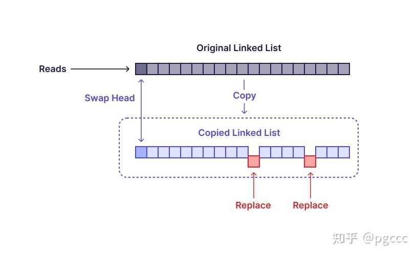 但是,当我们想要“一次性”(原子地)编辑列表中的多个条目时,例如当一个新压缩的段替换多个旧段时,会发生什么情况?如果只有主服务器重要,那么我们可以通过在列表本身上应用全局锁来保护多个列表节点的逻辑完整性,确保列表内容仅在有效状态下可见。但是副本服务器无法访问全局锁,因此无法同时协调跨多个节点(和多个缓冲区)的编辑。