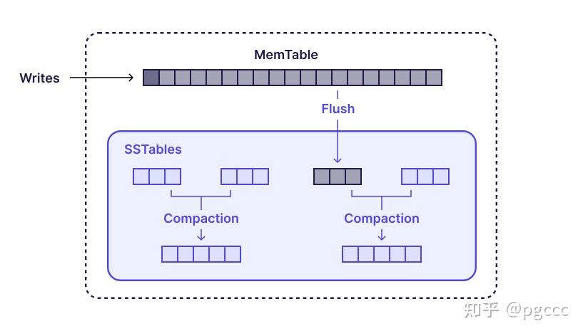LSM 树的核心思想是将随机写入转换为顺序写入。传入的写入首先存储在内存缓冲区(称为 memtable)中,该缓冲区更新速度很快。一旦 memtable 写满,它将被刷新到磁盘,形成一个已排序的、不可变的段文件(通常称为 SSTable)。