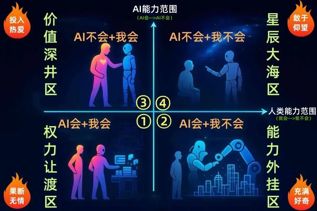 L老师:对。要看清未来,我们不能再用“AI vs 我”的线性思维。我们需要一个二维坐标系,来重新定位自己。这,就是我一直在思考的“人机协作四象限”。(L老师拿出本子,在纸上画了一个十字坐标) 想象一下,Y轴代表AI的能力范围,X轴代表人类的能力范围。将AI会、AI不会、人会、人不会这四个关键元素组合带入坐标中,可得四个象限,四个完全不同的“世界”。它们分别是:第一象限:AI会+我会;第二象限:AI会+我不会;第三象限:AI不会+我会;第四象限:AI不会+我不会。