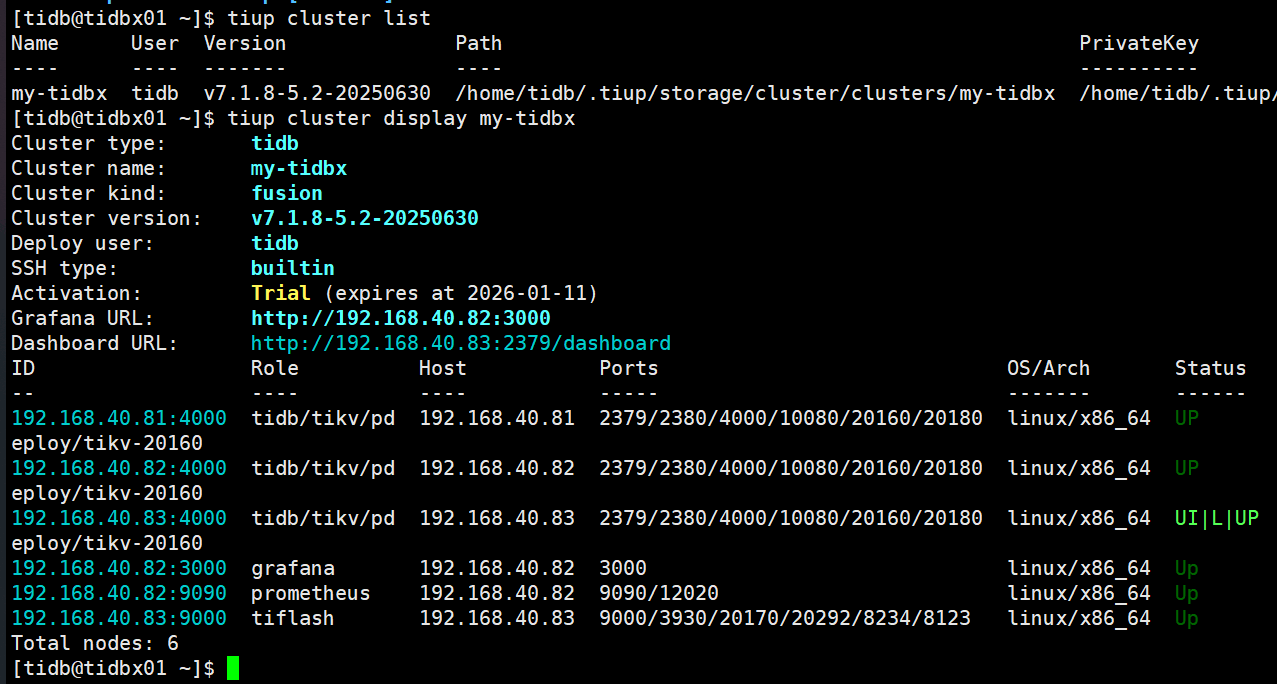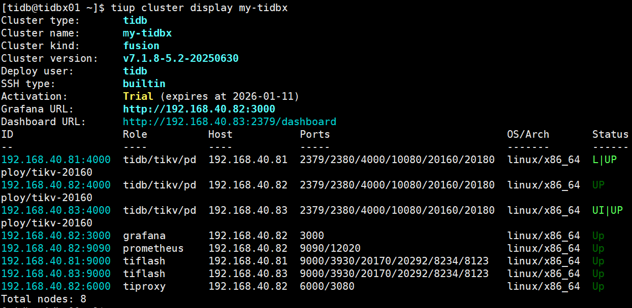 部署成功后,使用 TiUP 查看集群状态。