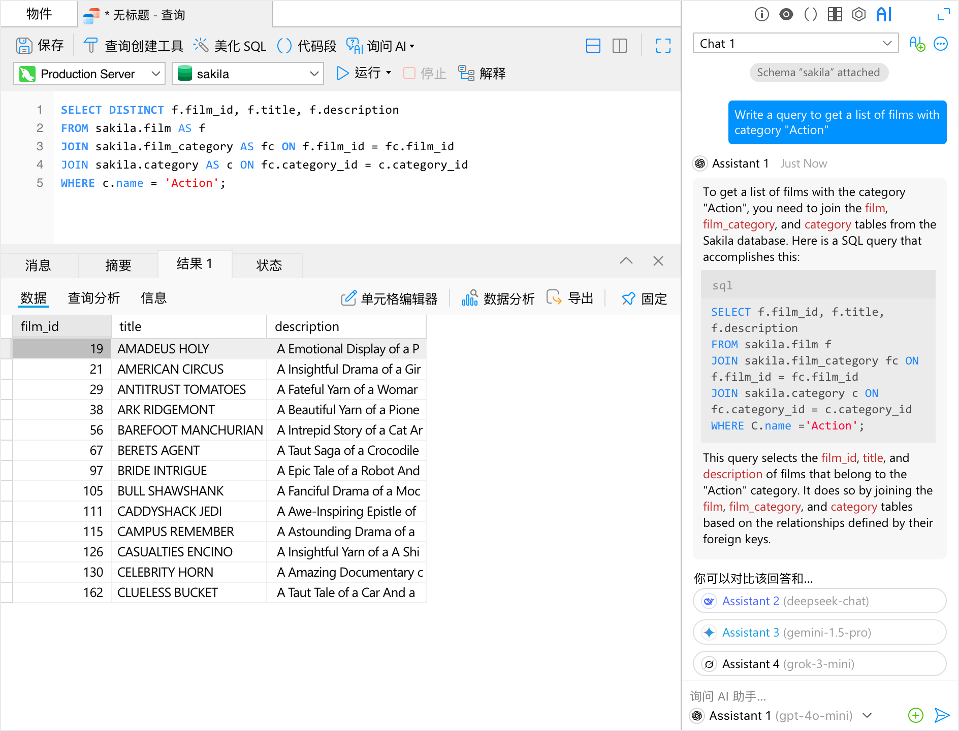 Navicat Premium 已内置 AI 助手,可调用 OpenAI ChatGPT、Google Gemini、DeepSeek 或 Ollama,一键生成、改写 SQL,大幅提升开发效率。