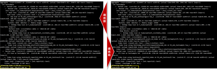 肿瘤患者检验记录校验SQL调优前后执行计划和执行时间对比