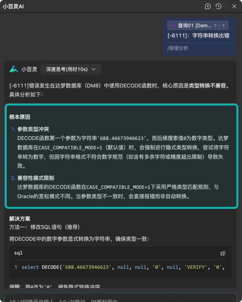 在达梦技术社区和用户服务过程中,我们发现有接近一半的用户问题来自错误码和报错信息的解析。小百灵 AI 集成了达梦内部最全的错误码处理知识库,遇到报错时点击“问AI”,即可获取原因与修复建议。