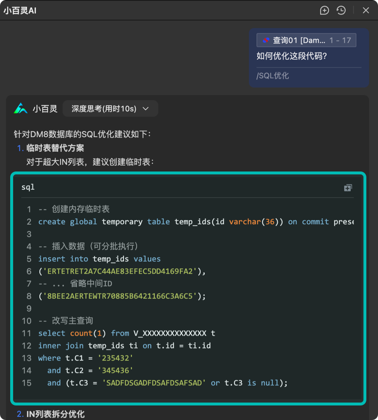 小百灵 AI 分析该 SQL ,建议通过创建临时表存储 IN 值的方式优化该语句。