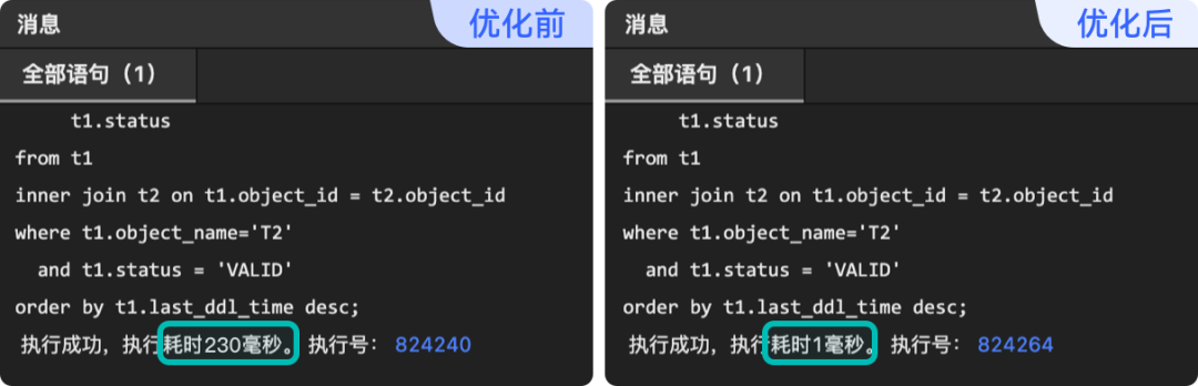 如下图示例,优化后查询执行耗时由原先的 230ms 缩减至 1ms。