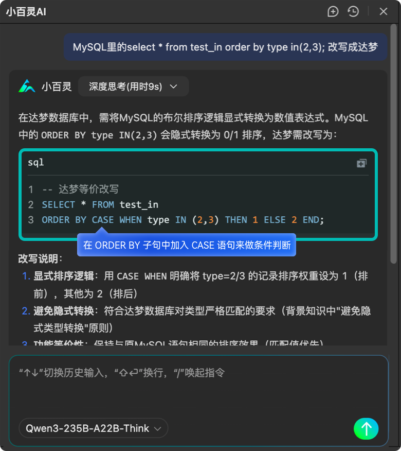 小百灵 AI 现已正式接入 Qwen3-235B-A22B 大模型,支持用户在使用达梦、Oracle、MySQL、PG 过程中,更高效地进行 SQL 编写、调试、调优等任务。