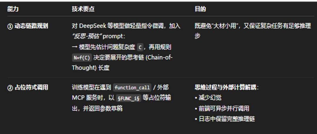 占位符输出:模型在推理草稿里用 §GRAPH§ / §FUNC§ / §MYSQL§ 等标记尚未获取的真实结果,避免臆测并把 I/O 与生成并行化。