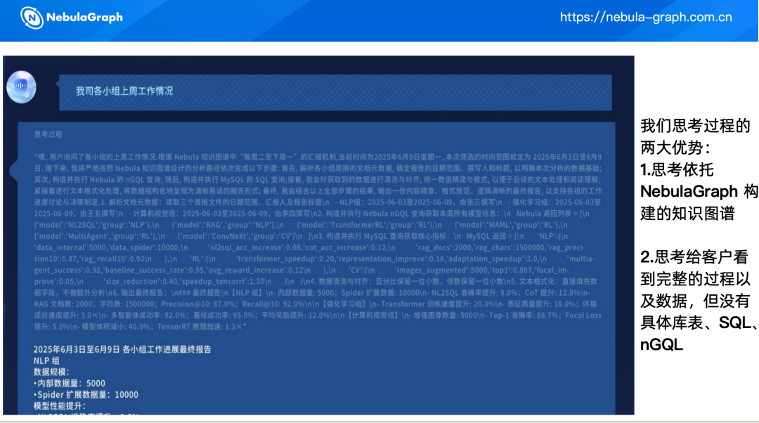 局限:趋势 / 创意生成受限(因偏结构填充)、长篇连续指代有内存与上下文风险、前期微调 & 建库成本高、运维面(LLM + NebulaGraph + MySQL)复杂、占位符流程需要精细脱敏与权限控制。