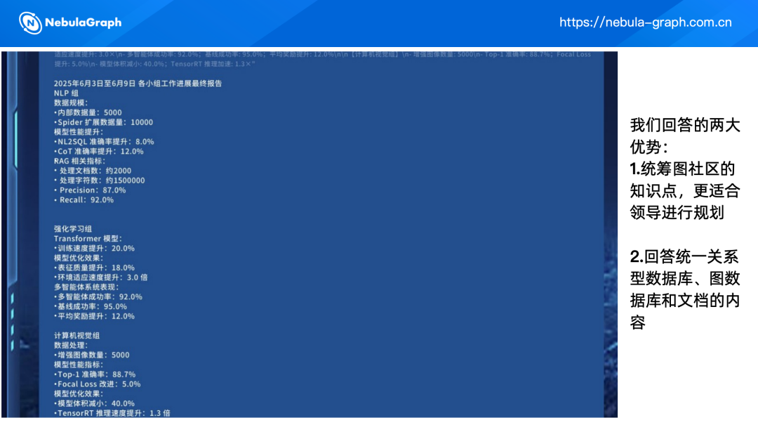 优势:减少幻觉(仅回答已存在实体 + 占位符后填)、检索并行加速、图多跳增强复杂推理、指标准确率接近 100%、模块解耦可独立迭代。