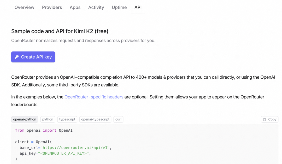 OpenRouter 为 400 多个模型和提供商提供了与 OpenAI 兼容的补全 API,可以直接调用,也可以使用 OpenAI SDK 调用。此外,还提供了一些第三方 SDK。