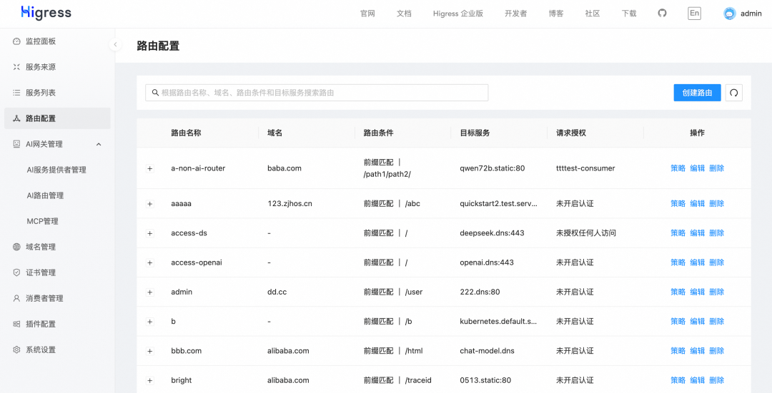 因此,从 Higress 控制台上看,提供了企业应用接入时的路由、域名、服务来源配置,同时提供消费者管理、证书管理和网关的 CPU、Memory、用户请求等观测指标。