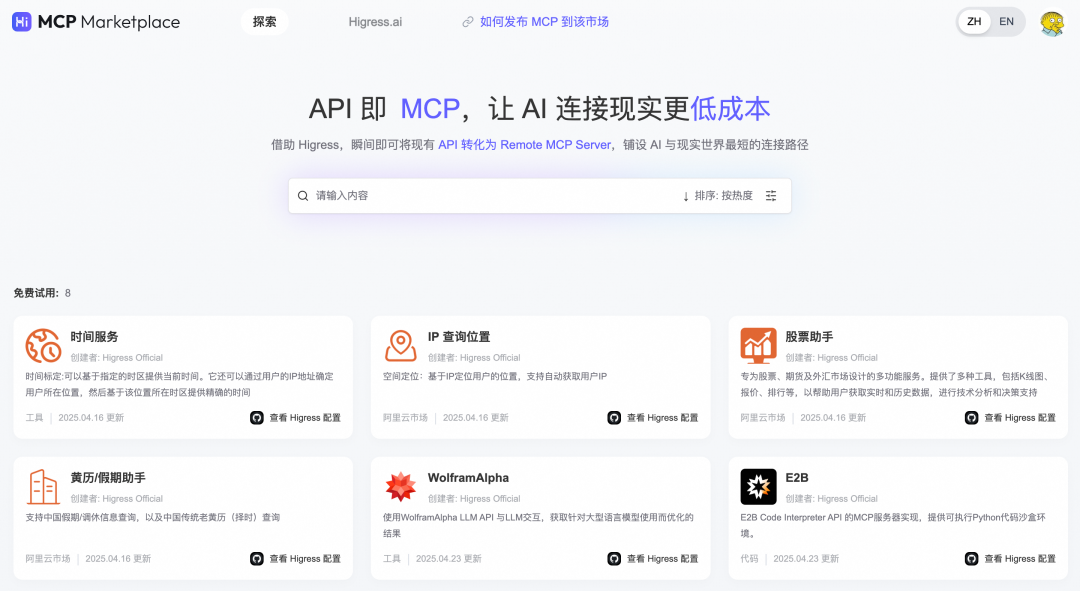 在 Higress 的 MCP 市场,可以将存量 API 转化为 Remote MCP Server,并上传到市场。