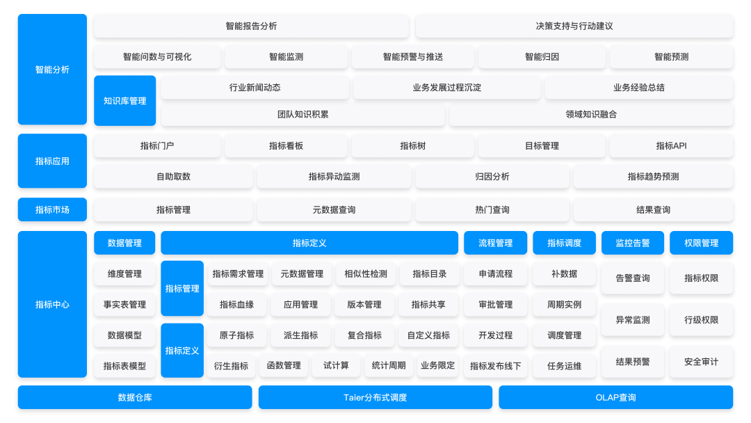 这一层是整个体系的物理底座,在数据仓库建设基础之上,通过 Taier 分布式调度保障数仓结果与指标计算的连贯性。OLAP 引擎保障了全量、多源数据的流畅对接,为指标建设提供高质量的事实与维度数据,同时为指标的高效计算与稳定服务提供基础能力。