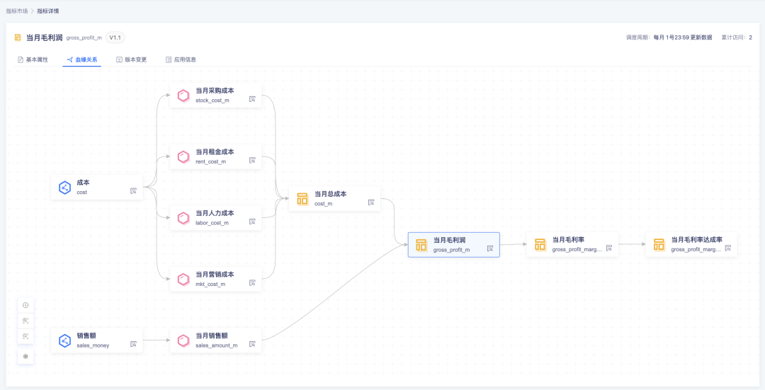 同时从业务视角、技术视角、管理视角统一指标定义规范,是后续企业级指标认知统一的基础。通过指标元数据、统计周期、业务限定等方式对指标的业务、技术、管理属性做精细化管理与差异化区分,依托平台可视化定义原子、派生、复合指标体系建立全局性的指标血缘管理规范,实现指标结构标准化,保障指标语义清晰、口径统一。