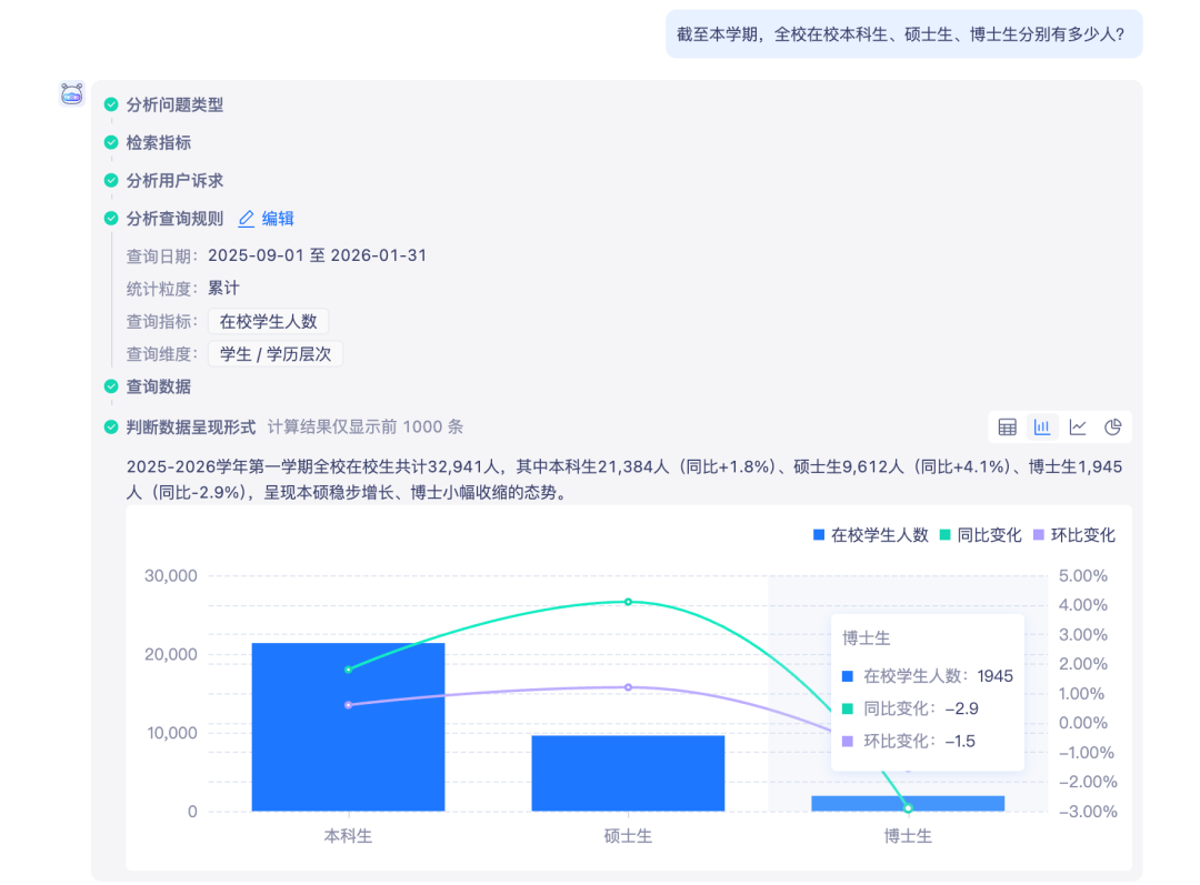 这一层是企业数据智能化的最高形态,通过深度融合AI技术与数据资产,构建"对话即分析"的智能交互范式。其核心突破体现在三个维度:首先,基于自然语言处理的智能问答引擎,支持用户通过对话方式直接查询指标数据、生成可视化图表,并能自动关联企业知识库中的业务背景信息,将原始数据转化为具有业务语义的洞察;