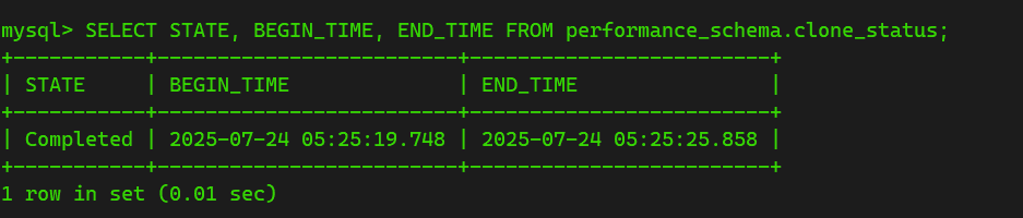 SELECT STATE, BEGIN_TIME, END_TIME FROM performance_schema.clone_status;