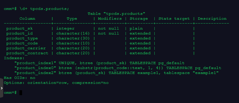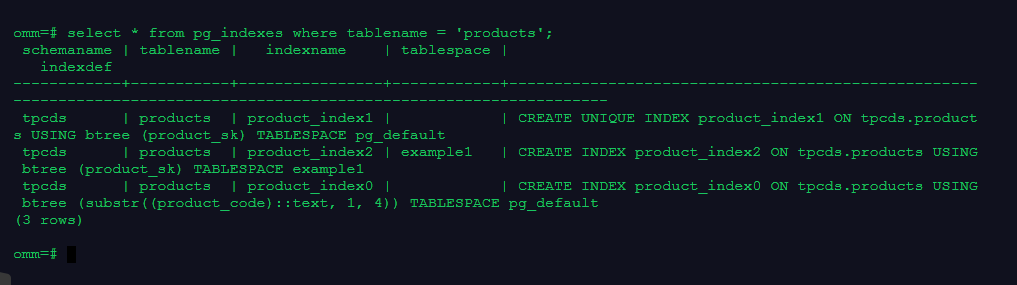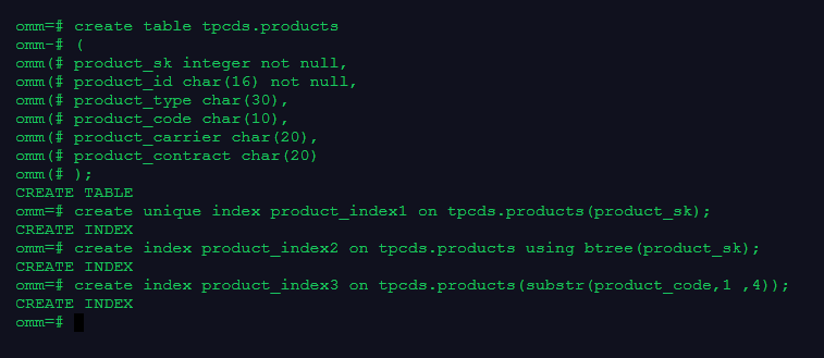 create table tpcds.products ( product_sk integer not null, product_id char(16) not null, product_type char(30), product_code char(10), product_carrier char(20), product_contract char(20) );create unique index product_index1 on tpcds.products(product_sk); create index product_index2 on tpcds.products using btree(product_sk); create index product_index3 on tpcds.products(substr(product_code,1 ,4));