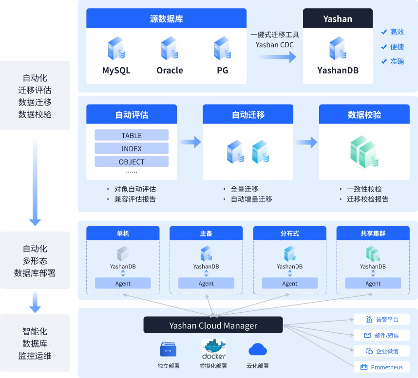 深度适配私有云,打破孤岛赋能增效: 针对政法多部门数据资源分散、利用率低的困境,YashanDB私有云解决方案深度集成现有政务云环境,提供用户自服务功能,实现数据库的自动化部署、纳管、监控与运维,有效整合资源、提升管理效率。
