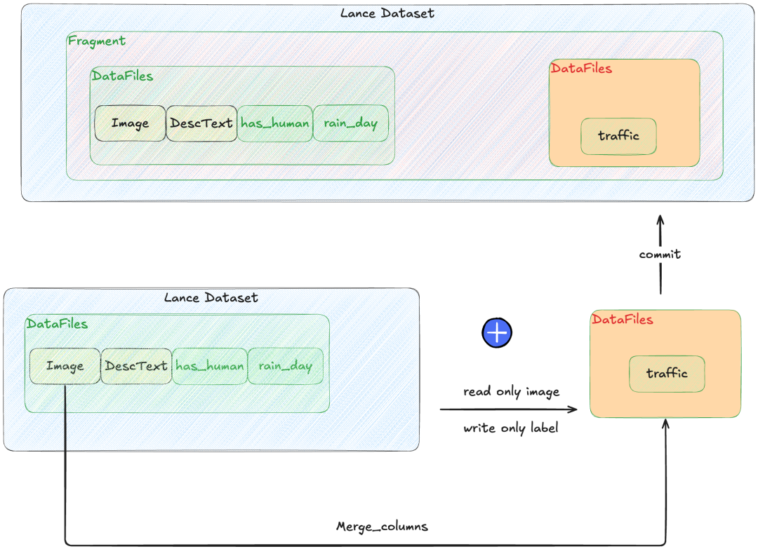 Lance提供zero-cost data evolution 机制,有力的支持了动态标注场景: