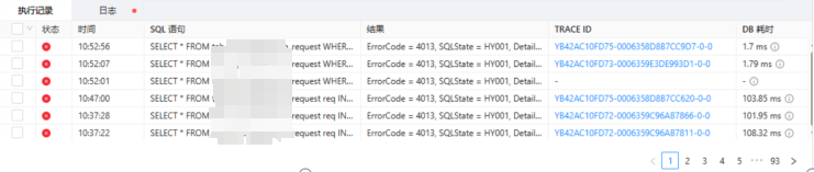 开发同学通过 ODC[1] 执行查询也报同样错误,在 ODC 的执行记录中可以直接看到 SQL 的 TRACE_ID 信息。