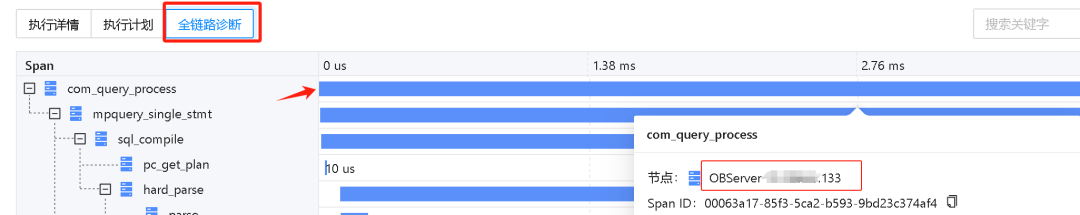 点击异常 SQL 的 TRACE_ID,会弹出如下界面,依次点击全链路诊断,鼠标移动到com_query_process
