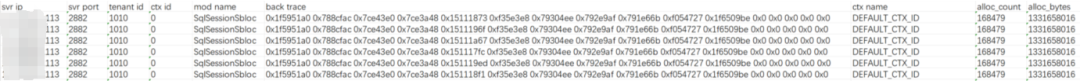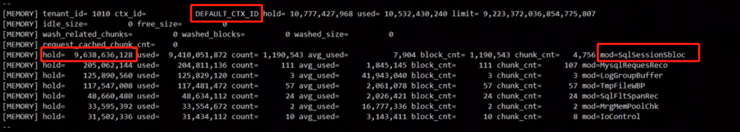 过滤 113 节点 的 OBServer 日志,查看 1010 租户 的上下文 DEFAULT_CTX_ID中各个mod的内存使用,显示 SqlSessionSbloc 这个 mod 占用内存最大,几乎用了整个租户 80% 以上的内存。通过一段时间观测内存使用会持续增加,最终导致租户内存用满。