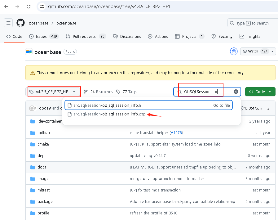 打开 OceanBase 社区版[4],选择最新发布版本,通过 ObSQLSessionInfo 关键字,找到代码文件ob_sql_session_info.cpp