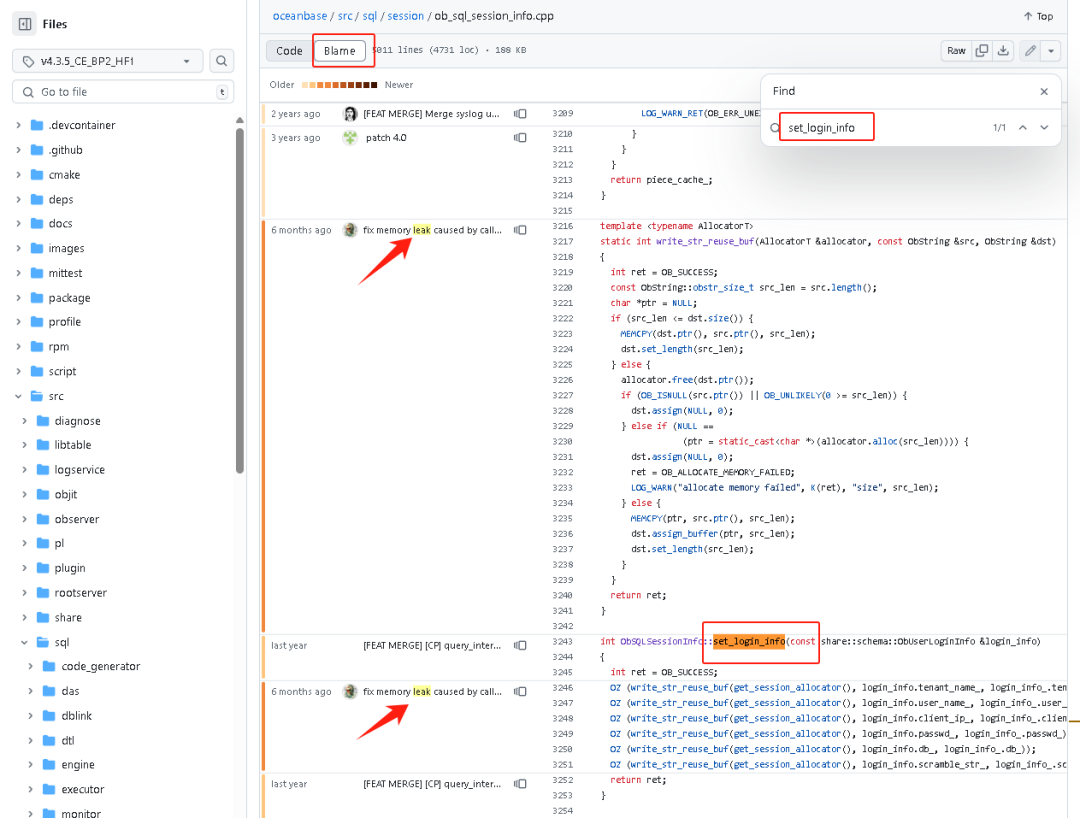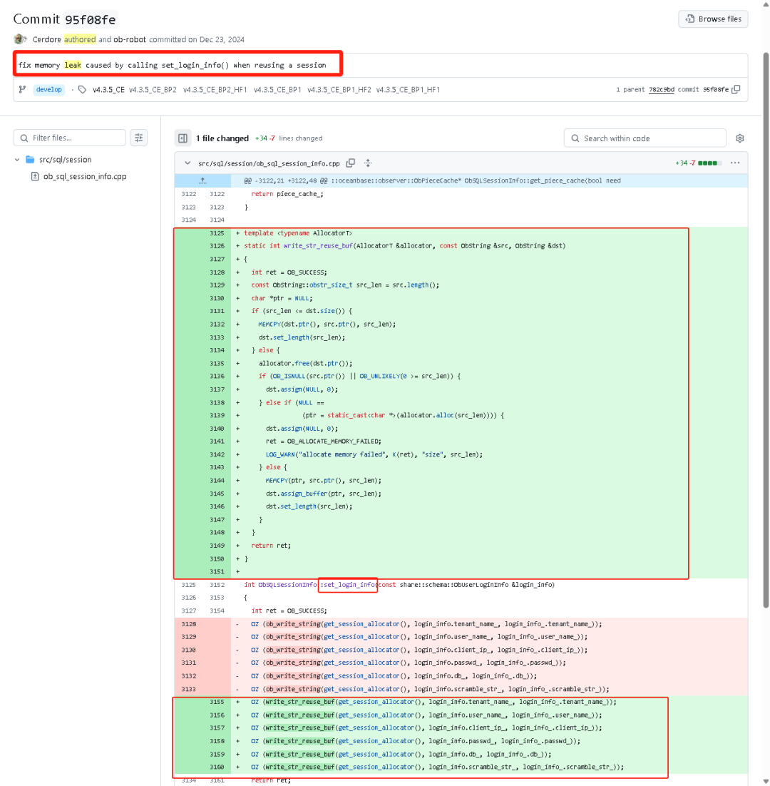 打开包含 fix memory leak 的代码提交的链接,可以看到该 commit 修复了一个由于 OceanBase 内部在复用一个会话时,直接分配内存(而不是尝试复用已有的内存),导致了内存泄露问题(fix memory leak caused by calling set_login_info() when reusing a session
