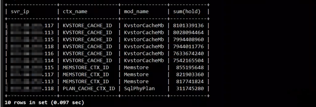 SELECT svr_ip,ctx_name,mod_name ,sum(hold) FROM oceanbase.__all_virtual_memory_info WHERE tenant_id = 1010 group by svr_ip,ctx_name,mod_name order by sum(hold) desc limit 10;