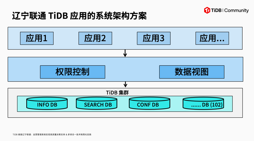 系统架构:所有项目通过权限控制、数据视图连至单个 TiDB 集群,替代多数据库独立部署。